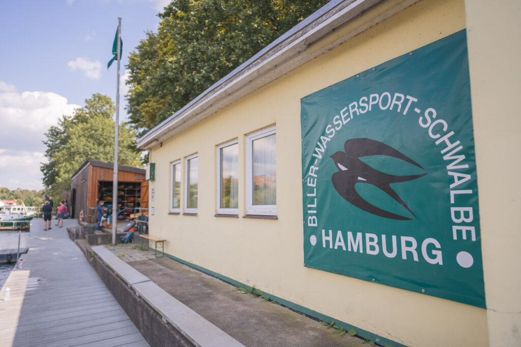 Bei uns kannst du vom bequemen Steg aus in eins der schönsten Paddelreviere Hamburgs gleiten.